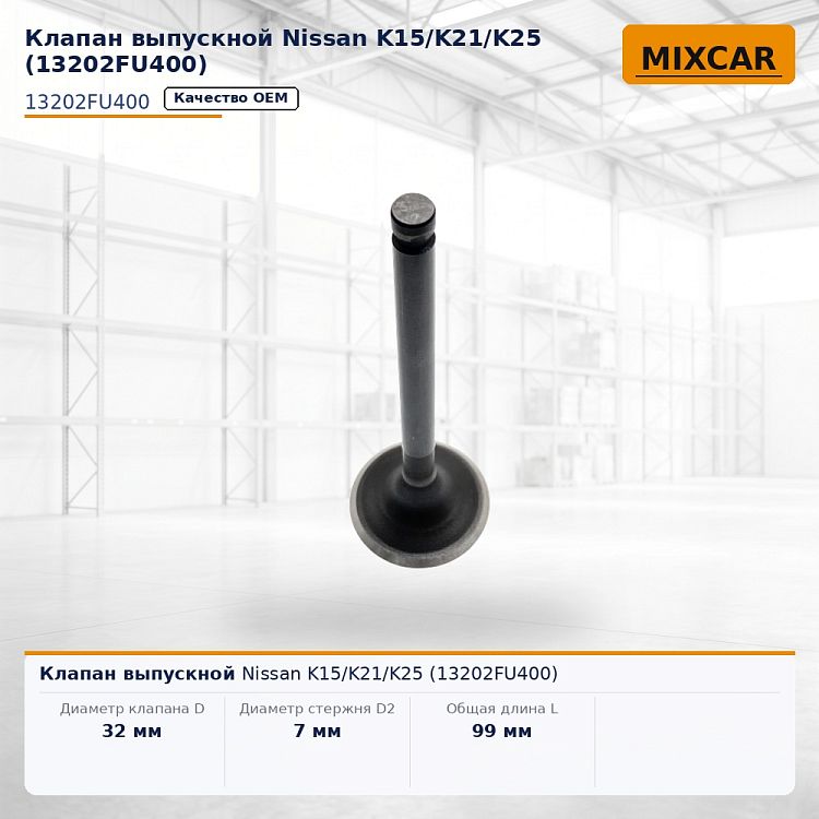 Характеристики: Диаметр клапана D (мм) 32;; Диаметр стержня D2 (мм) 7;; Общая длина L (мм) 99.