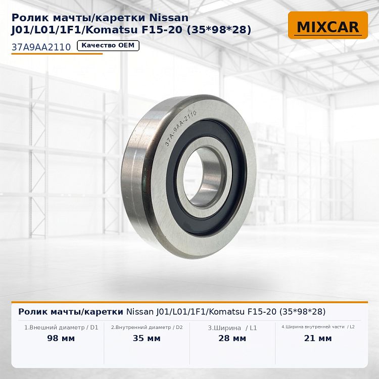 Характеристики: 1.Внешний диаметр / D1 - 98 мм;; 2.Внутренний диаметр / D2 - 35 мм;; 3.Ширина / L1 - 28 мм;; 4.Ширина внутренней части / L2 - 21 мм.